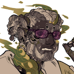 One of the CEO's of Leaping Bunny and the official death bringer to many people that decide to clash with them. They are the leader of a large and very loyal cartel group that has their base on Xuxia. Specializing on hit jobs and making people dissappear- in the nastier way that the Twins wouldnt agree with, all under the philosphy of glorifying death at every turn. Often, dealing with this strange yet charismatic preacher can be met with loss of limbs and even self for the ones that suffered one of their "kisses of death". They are dangerously mutated and wanted in various planets for their crimes against Alphean kind. Their cartel is well known for moving major drug trades across the system.